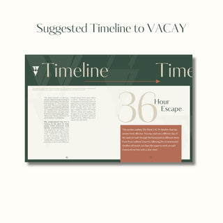 You’ll find our suggested 36-hour VACAY timeline—a simple guide to help you plan realistically and prioritize the time you need to step away with purpose. It takes the guesswork out of how long to pause and gives you a structure that fits your life and goals. Looking for a longer escape? We've got options for that too.