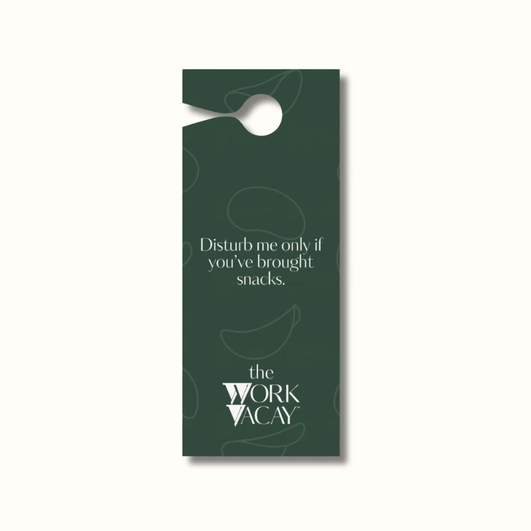 The Work VACAY™ Book comes with a free door hanger—because your reset deserves some boundaries (and maybe some snacks). One side says “Pause in Progress. Please respect the reset.” The other? A playful reminder: “Disturb me only if you’ve brought snacks.” Consider it a little bonus to protect your focus and add some fun to your retreat.